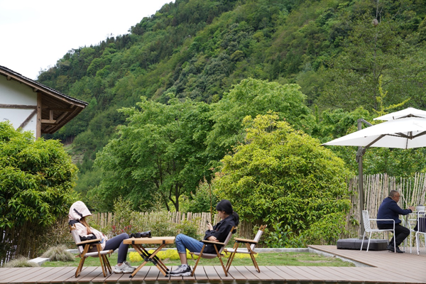 在雅安,优良的生态环境吸引游客前来度假消费,生态经济成为经济主体。图为宝兴熊猫新村里游客在座椅上小憩。(摄影:虞向军)