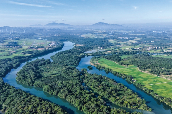 2025年9月17日,位于湖南省永州市道县祥霖铺镇两河口村的沱江与永明河交汇处,青山绿水、蓝天白云共同编织出一幅壮美的秋日生态画卷