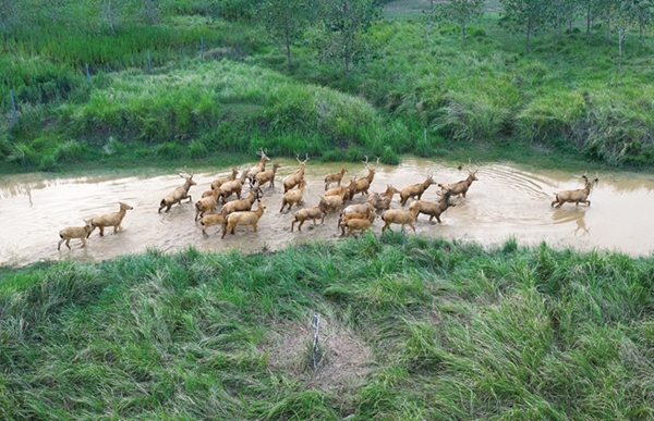 2025年9月13日,江苏盐城,国家一级重点保护野生动物麋鹿在东台条子泥湿地嬉戏觅食