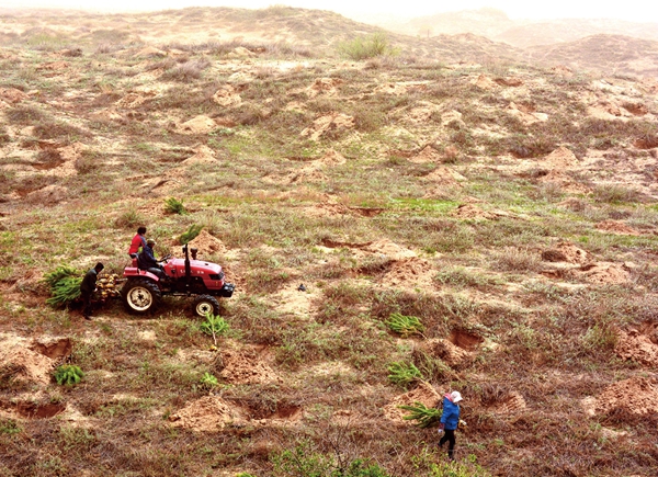 在治沙一线,当地技术人员摸索出了一套深坑投苗、浅层覆土的苗木栽植新方法,不仅降低了造林成本,还极大加快了成林速度,在治沙过程中发挥了重要作用。