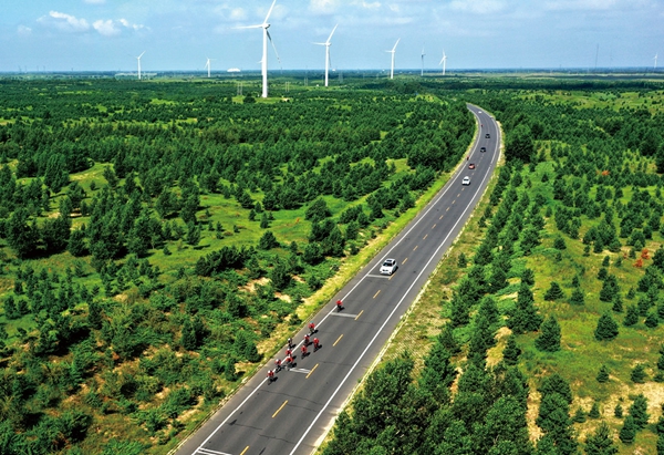 盛夏时节,走进内蒙古自治区通辽市努古斯台“双百万亩”综合治理项目区,很难将这个地方与贫瘠、荒凉等词联系起来。山坡上林深草茂,目之所及一片青绿,高大的风机点缀其中,安静地旋转着。树林掩映着大片的湿地,为水禽提供栖身之所。曾经“风沙赶着人跑”的不毛之地,如今变成了居民和游客避暑消夏的美丽场所。