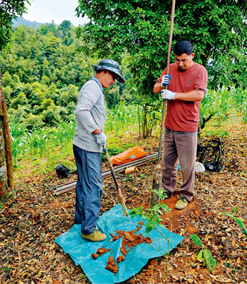 在云南红河地区某采样点现场,两位采样师傅相对而立,共同手握一根细长的管状工具——“赣南钻”,他们默契地同时发力,随后将工具稳稳地扎入设定位置的土壤中。