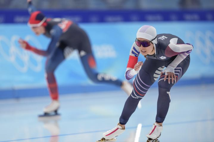2月7日,北京冬奥会速度滑冰女子1500米决赛在国家速滑馆“冰丝带”打响。中国台北选手黄郁婷出场时,现场观众报以热烈掌声和助威声。