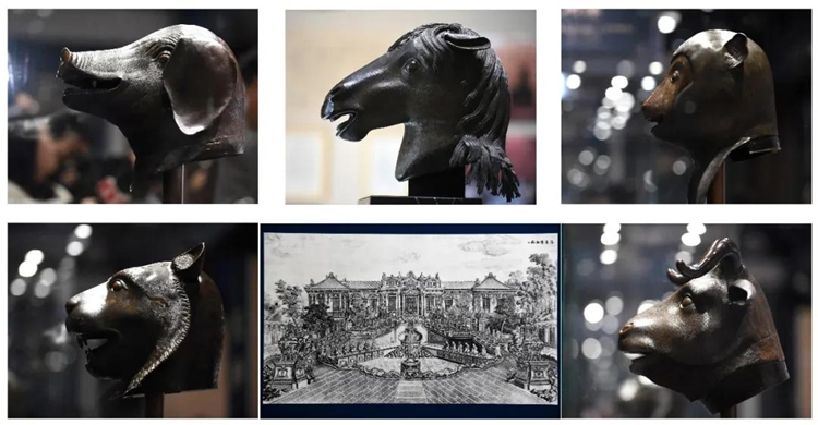 这是一张拼版照片:上三图分别是猪首、马首、猴首铜像(从左至右);下三图分别为虎首铜像、现场展出的可看出十二兽首当年位置的圆明园铜版画、牛首铜像(从左至右,2023年10月20日摄)。2023年10月18日,由保利艺术博物馆收藏的圆明园十二兽首之牛首、虎首、猴首、猪首铜像,与在2020年12月1日正式回归圆明园的马首铜像一起,亮相“五首重聚·故园新语”圆明园兽首铜像特别展览,这是自1860年英法联军火烧圆明园后,五兽首首次重聚圆明园 新华社记者 罗晓光 摄
