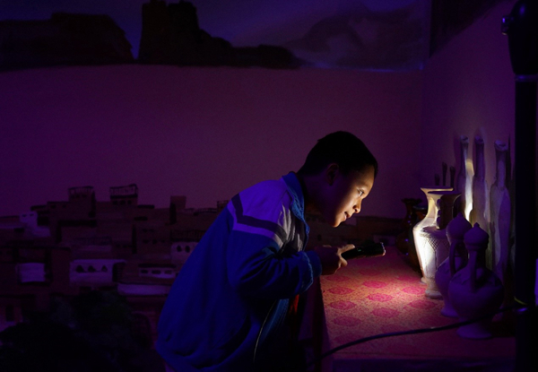 “古城寻宝”游戏,拿着手电筒找寻各种“宝藏”,通过打光感受“宝藏”色彩的变化,把孩子们带入如同“盗墓笔记”般的场景里,惊险刺激又充满乐趣