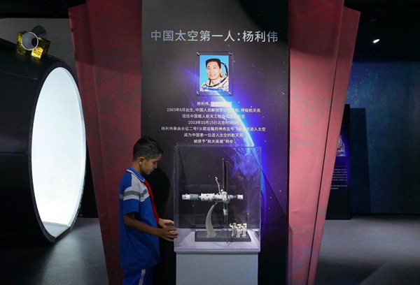 一名同学在观察空间站的模型,场馆内还存有杨利伟的亲笔签名照,有前辈的激励,他的明天也许飞得更高、走得更远