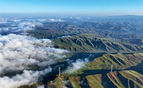2025年8月16日,宁夏固原,俯瞰西吉县新营乡月亮山风电场,一台台风力发电机屹立在高山之巅和云雾之间,源源不断地输送绿色能源