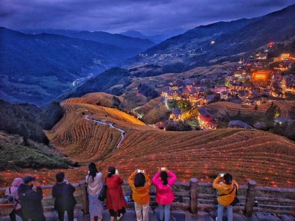 2025年10月23日,广西桂林龙胜县,游客在龙脊镇观看梯田夜景