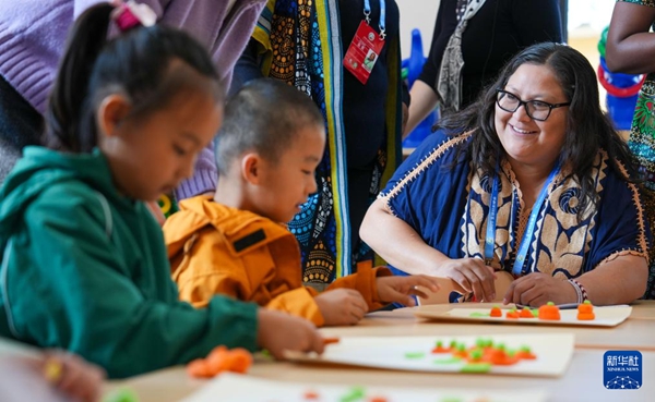10月14日,全球妇女峰会参会嘉宾在北京市顺义区妇女儿童社会服务中心参访。(新华社记者 颜麟蕴 摄)