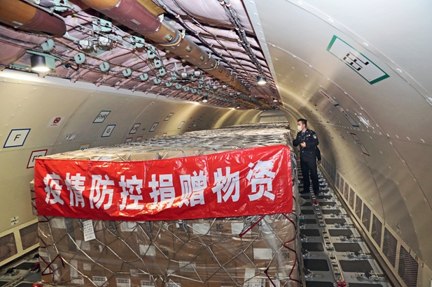 1 de marzo de 2020. Materiales médicos como ropas de protección y mascarillas, donados por India a la Cruz Roja de Wuhan, llegan al Aeropuerto Internacional Xingdong de Nantong, provincia de Jiangsu. Cnsphoto