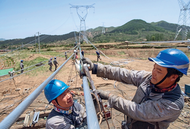 1 de junio de 2020. En la aldea de Tangziling de la provincia de Hebei, trabajadores de Anhui Power Transmission and Transformation Engineering Co., Ltd. extienden líneas de transmisión UHV de 1000 kV.