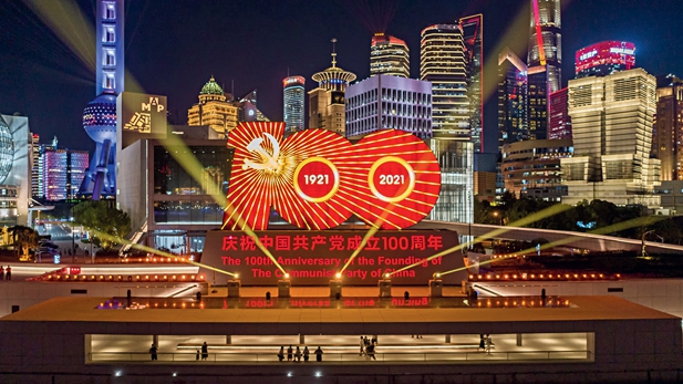 22 de junio de 2021. Espectáculo de luces cerca de la zona del Bund en Shanghai, en celebración por el centenario del Partido Comunista de China.