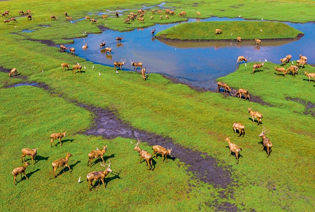 10 de octubre de 2021. Una manada de ciervos milú en el Parque Nacional de Humedales de Qinhu, en la ciudad de Taizhou, provincia de Jiangsu.