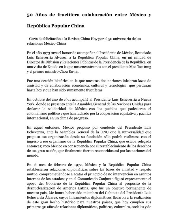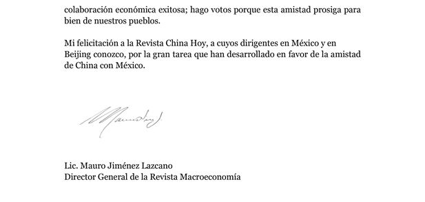 El 11 de enero del año presente, la revista China Hoy del Centro para las Américas del Grupo de Comunicaciones Internacionales de China recibió una carta de felicitación del señor Mauro Jiménez Lazcano, director general de la revista Macroeconomía. En la carta, el señor, que tiene más de 70 años, recuerda el encuentro histórico de los líderes de ambos países (China y México) en 1973, que él presenció en calidad de director de Difusión y Relaciones Públicas de la Presidencia de México. Con motivo del 50.º aniversario del establecimiento de relaciones diplomáticas entre China y México, Mauro Jiménez también felicita a la revista China Hoy, por la gran tarea desarrollada en favor de la amistad China-México.