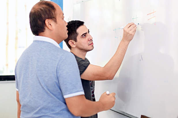 6 de abril de 2019. Un estudiante hace un ejercicio en la pizarra bajo la supervisión de su maestro en el Instituto Confucio de la Universidad Autónoma de Yucatán, México.