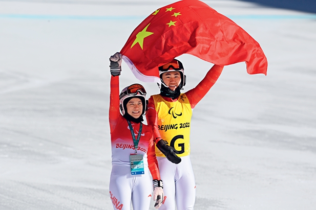 5 de marzo de 2022. La paraesquiadora Zhu Daqing (izq.) celebra con su guía, Yan Hanhan, después de ganar la medalla de plata en la supercombinada de esquí alpino para discapacitados visuales femenina.