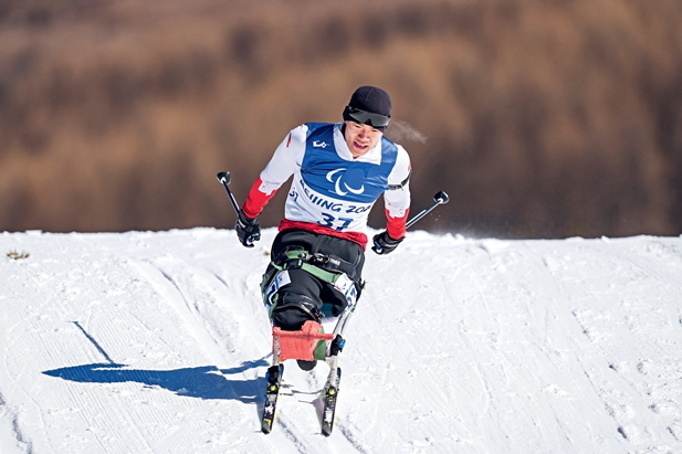5 de marzo de 2022. Liu Zixu durante el evento de parabiatlón en Zhangjiakou, provincia de Hebei. Fotos de Xinhua