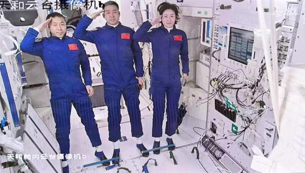 Los tres astronautas de la Shenzhou-14, Chen Dong (centro), Liu Yang (der.) y Cai Xuzhe, saludan tras entrar en el módulo central Tianhe de la estación espacial de China. Xinhua