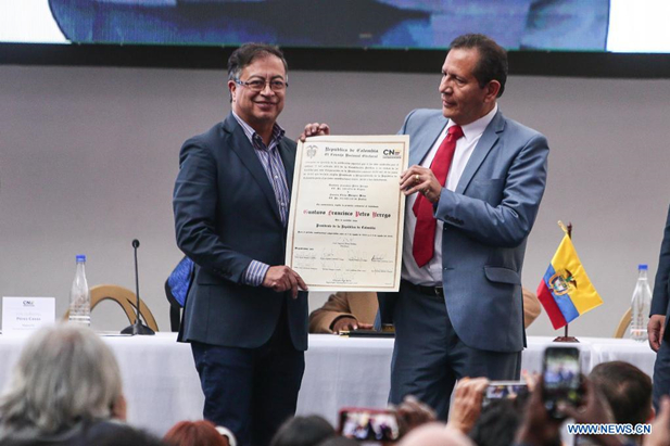 23 de junio de 2022. El presidente electo de Colombia, Gustavo Petro (izq), recibe su credencial que lo acredita como presidente electo, en la Registraduría Nacional del Estado Civil, en Bogotá, Colombia. Xinhua