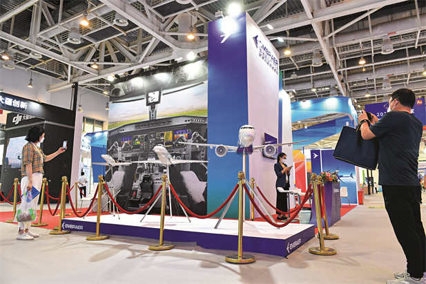 9 de septiembre de 2021. Exhibición de un modelo de avión en el stand de la empresa Embraer de Brasil en la Exposición de la Nueva Revolución Industrial BRICS 2021, celebrada en la ciudad de Xiamen, provincia de Fujian. Wei Yao