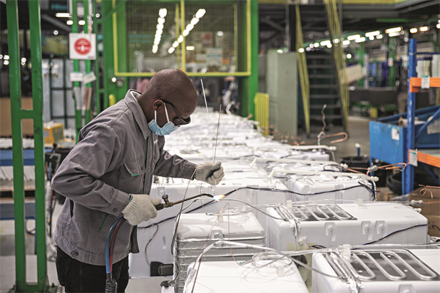 1 de junio de 2022. Un empleado local trabaja en una línea de producción de refrigeradores en el Parque Industrial de Hisense en Ciudad del Cabo, Sudáfrica. Xinhua