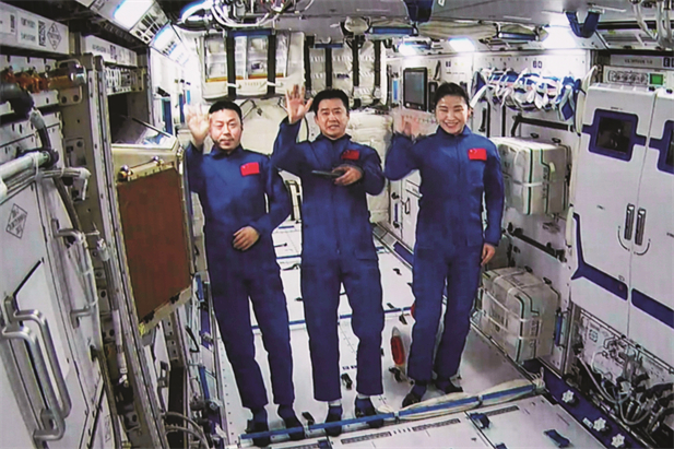 25 de julio de 2022. Los tres astronautas chinos Chen Dong (centro), Liu Yang (der.) y Cai Xuzhe entran en el módulo de laboratorio Wentian. Xinhua