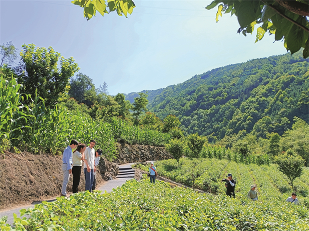 Chen Fuyan, secretaria de la célula del PCCh de la aldea de Tianba, acompaña al embajador de Argentina en China, Sabino Vaca Narvaja, a visitar el jardín ecológico de té en dicha aldea. Fotos cortesía del autor