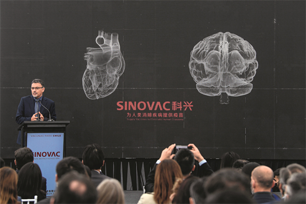 12 de mayo de 2022. Flavio Salazar, entonces ministro de Ciencia, Tecnología, Conocimiento e Innovación de Chile, en el inicio oficial de la construcción de la planta de envasado y terminado de vacunas del laboratorio chino Sinovac en la comuna de Quilicura, en Santiago de Chile. Xinhua