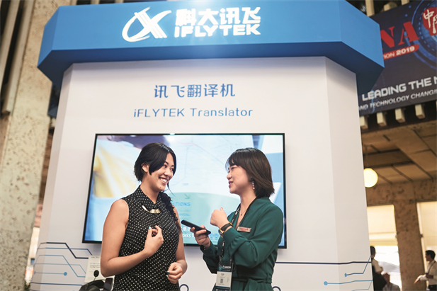 4 de septiembre de 2019. Una visitante prueba una máquina de traducción en el stand de iFLYTEK en la inauguración de la 34.ª reunión de la Conferencia Internacional de Tecnologías de la Información y las Comunicaciones de Colombia.