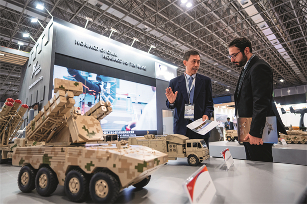 11 de abril de 2023. Un empleado de China North Industries Corporation (izq.) muestra diversos objetos a un visitante, en el marco de la exposición LAAD Defence & Security, celebrada en Río de Janeiro, Brasil. Xinhua