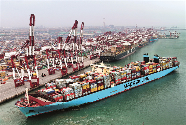 29 de julio de 2022. El buque portacontenedores “Maersk Line”, de la ruta comercial europea, zarpa del muelle Qianwan en el puerto de Qingdao, provincia de Shandong. Xinhua