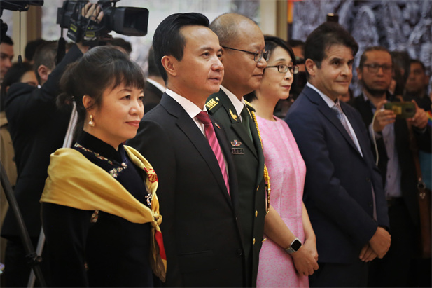 El embajador de China en México, Zhang Run, junto con su esposa Duan Niyan, acompañados por el agregado de defensa, coronel superior Cui Yongmao, y su esposa Qiao Lan, dieron la bienvenida a todos los asistentes.