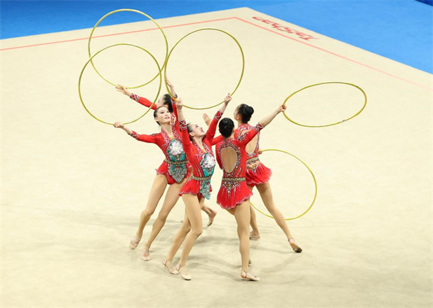El equipo de China compite durante la Rotación Final 1 del All-Around de Grupo en la 31ª edición de verano de los Juegos Mundiales Universitarios de la FISU, en Chengdu, en la provincia de Sichuan, en el suroeste de China, el 29 de julio de 2023.