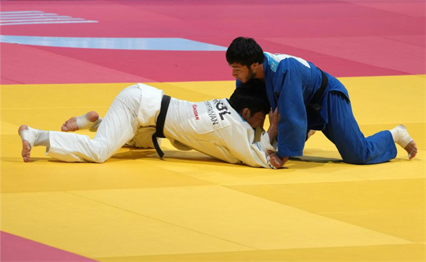 Kamoliddin Bakhtiyorov (d), de Uzbekistán, compite con Sumiyabazar Enkhtaivan, de Mongolia, durante las competencias por las medallas de bronce de judo masculino de 60kg en la 31ª edición de verano de los Juegos Mundiales Universitarios de la FISU, en Chengdu, en la provincia de Sichuan, en el suroeste de China, el 29 de julio de 2023.