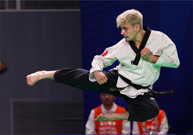 Emir Yilmaz, de Turquía, compite durante la final de poomsae individual masculino de Taekwondo en la 31ª edición de verano de los Juegos Mundiales Universitarios de la FISU, en Chengdu, en la provincia de Sichuan, en el suroeste de China, el 29 de julio de 2023.