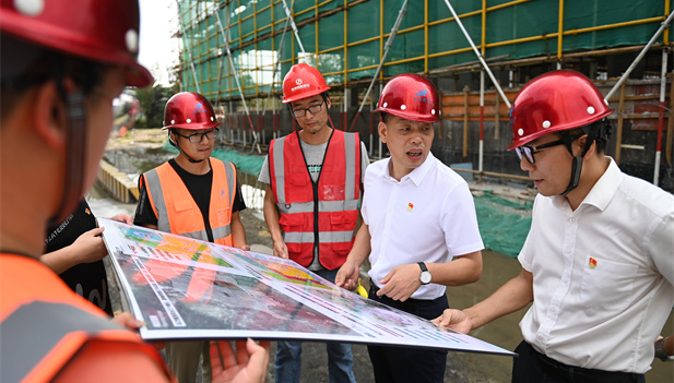 16 de septiembre de 2022. Fu Pingjun (segundo desde la der.), director del comité de la aldea de Tengtou y delegado del XX Congreso Nacional del Partido Comunista de China, revisa construcción de un edificio de la aldea. Xinhua