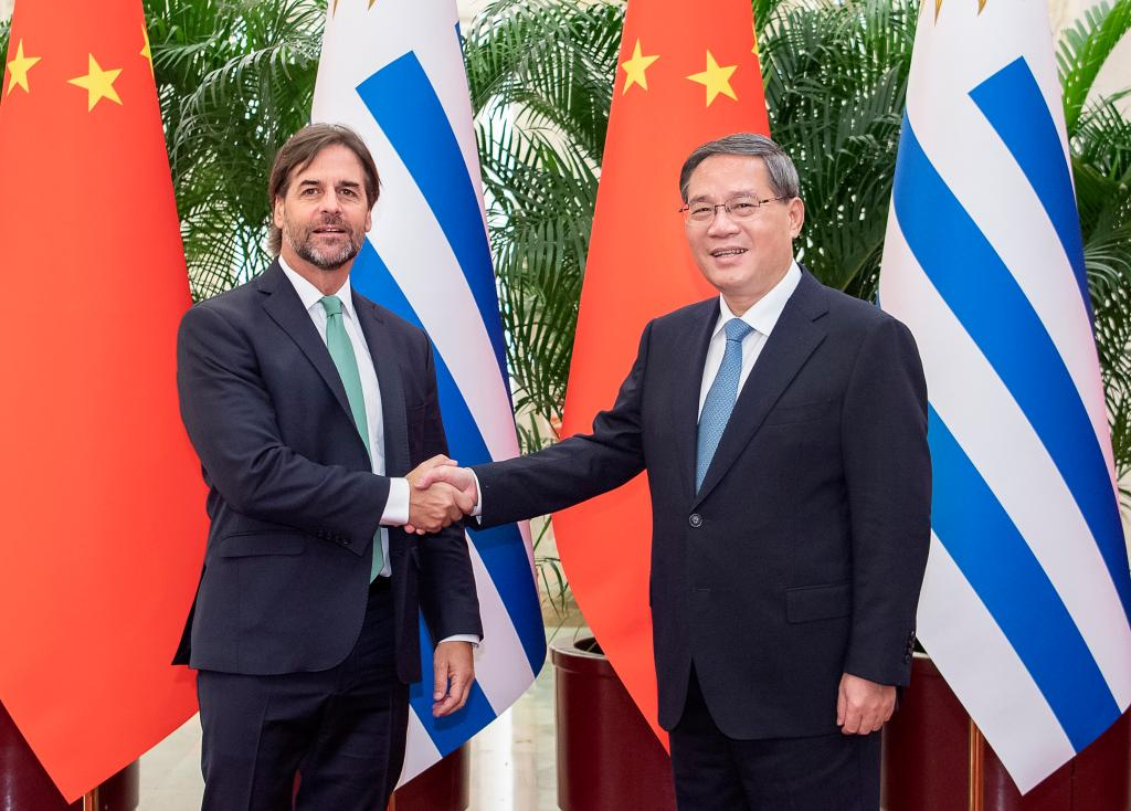 El primer ministro chino, Li Qiang, se reúne con el presidente uruguayo, Luis Alberto Lacalle Pou, en el Gran Palacio del Pueblo, en Beijing, capital de China, el 23 de noviembre de 2023. El primer ministro chino, Li Qiang, se reunió el jueves en Beijing con el presidente uruguayo, Luis Alberto Lacalle Pou. Li afirmó que desde el establecimiento de las relaciones diplomáticas, hace 35 años, las dos partes siempre han adherido al entendimiento mutuo, la confianza mutua y el apoyo mutuo, y las relaciones bilaterales han logrado un desarrollo de alto nivel. Tras señalar que China y Uruguay anunciaron conjuntamente el miércoles el establecimiento de una asociación estratégica integral, Li aseguró que China está lista para trabajar con el país sudamericano para seguir la orientación estratégica de los dos jefes de Estado y promover las relaciones bilaterales con nueva vitalidad y nuevos logros. Li pidió a las dos partes que den un buen ejemplo de relaciones bilaterales caracterizadas por el respeto mutuo y la confianza entre países con diferentes sistemas sociales, el beneficio mutuo y la complementariedad entre países con economías de diferentes tamaños, y el aprendizaje mutuo entre países con diferentes trasfondos culturales. El premier chino manifestó su esperanza de que los dos países continúen apoyándose mutuamente con firmeza en cuestiones relacionadas con sus intereses fundamentales y sus principales preocupaciones. Asimismo, instó a las dos partes a defender el principio de beneficio mutuo y cooperación mutuamente beneficiosa, aprovechar al máximo sus ventajas complementarias y tomar la firma del plan de cooperación de la Franja y la Ruta como una oportunidad para promover el crecimiento continuo y la mejora del comercio bilateral y favorecer el comercio y la inversión. También pidió a las dos partes que fortalezcan la cooperación en energía limpia, comunicaciones, innovación científica y tecnológica y finanzas, y que amplíen los intercambios entre pueblos en campos como la cultura y el turismo, la educación, los deportes y la cooperación a nivel local. China apoya a Uruguay para que desempeñe un papel más importante en los asuntos regionales y está dispuesta a trabajar con Uruguay para profundizar la cooperación general entre China y América Latina, promover la construcción de una comunidad China-América Latina con un futuro compartido, defender el multilateralismo y una economía mundial abierta, y salvaguardar mejor la equidad y la justicia internacionales, afirmó Li. Por su parte, Lacalle manifestó que el establecimiento de la asociación estratégica integral entre Uruguay y China ha abierto amplias perspectivas para el desarrollo de las relaciones bilaterales. Tras manifestar que Uruguay está firmemente comprometido con estrechar las relaciones con China y participa activamente en el desarrollo conjunto de la Iniciativa de la Franja y la Ruta, Lacalle afirmó que su país está dispuesto a mantener su amistad tradicional con China, profundizar la confianza política mutua, fortalecer los intercambios y la cooperación con China en economía, comercio, inversión, cultura, educación y entidades municipales y regionales, y acelerar la construcción de una asociación de libre comercio entre Uruguay y China, así como entre el Mercosur (Mercado Común del Sur) y China, a fin de promover el desarrollo continuo y a fondo de las relaciones bilaterales. |