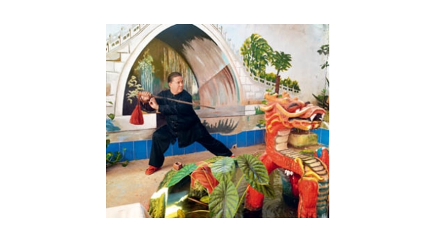 El maestro posa con sable en el jardín chino de la Escuela Cubana de Wushu.