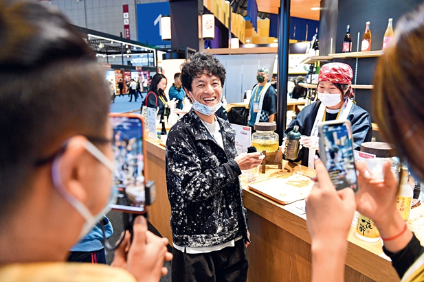 6 de noviembre de 2021. El director de documentales japonés Ryo Takeuchi promociona el vino de arroz japonés en una transmisión en vivo realizada durante la cuarta Exposición Internacional de Importaciones de China, celebrada en Shanghai. Wei Yao
