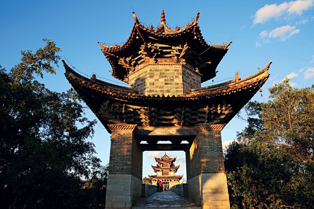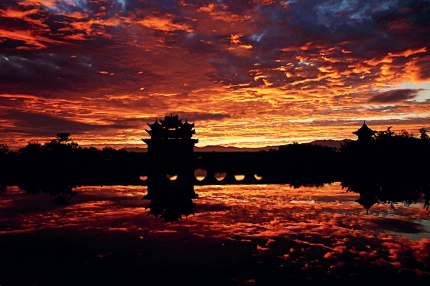 En la confluencia de los ríos Lujiang y Tachong se encuentra el puente Shuanglong (“Dos Dragones”, en español), cuyo nombre proviene precisamente de los dos afluentes que se enroscan como si fueran dos dragones. Se dice que el puente –con 17 arcos y un pabellón en cada extremo– parece un arcoíris que se extiende sobre el río. Al amanecer y al anochecer, los visitantes pueden disfrutar del sonido de las campanillas que, al compás del viento, cuelgan de las cornisas de los dos pabellones. Sus melodías parecen sacadas del paraíso. A su vez, con cada salida y puesta del sol, el reflejo de las brillantes nubes rosadas en la superficie del río da a los arcos del puente un singular aire, como si se trataran de puertas conducentes a un misterioso mundo.
