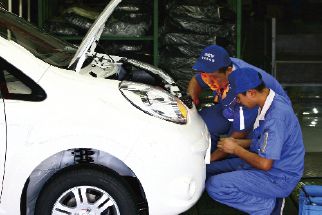 Dos obreros ajustan el sistema de iluminación de un vehículo eléctrico de Jiangling.