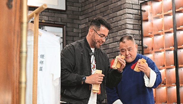 24 de abril de 2025. El artista Wang Wenshui (der.) enseña a Franco Raydis, un profesor de español venezolano, a tocar kuaiban (una forma de arte narrativo chino con unas pequeñas tablas de bambú) en una casa de té en el distrito de Hongqiao, Tianjin.