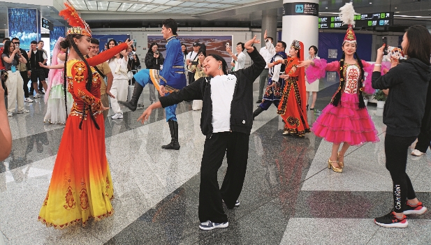 1. 21 de julio de 2025. Bailarines de Kazajistán interactúan con artistas locales que les dan la bienvenida en el Aeropuerto Internacional Tianshan, en Urumqi.