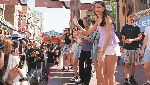 2. 22 de julio de 2025. Miembros del Balletto di Milano, una compañía de ballet italiana, saludan al público luego de una actuación en el Gran Bazar Internacional de Urumqi.