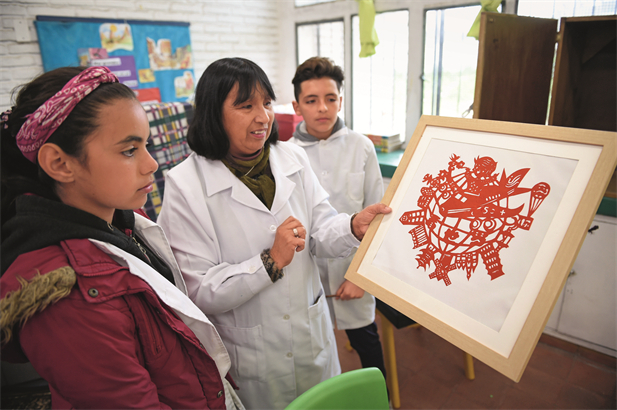 2 de octubre de 2019. Una maestra de la escuela primaria República Popular China en Montevideo muestra a sus alumnos el arte chino del recorte de papel. ¿No es placentero aprender algo y después ponerlo en práctica a su debido tiempo? ¿No es agradable recibir a amigos que vienen de lejos? En las aulas de la escuela primaria República Popular China en Montevideo, capital de Uruguay, se cuelgan citas célebres de Analectas de Confucio escritas en chino, como una clara muestra de la unión de voluntades entre el pueblo chino y el uruguayo. En los últimos años, China y los países latinoamericanos y caribeños han continuado con su espíritu de cooperación en el marco de la Iniciativa de la Franja y la Ruta en materia educativa, cultural y entre personas, lo cual ha dado lugar a un nutrido intercambio. Mayor conocimiento de China La escuela República Popular China, construida con asistencia del Gobierno chino, está ubicada en el barrio de Casavalle, el cual es relativamente pobre. Tiene un departamento de educación preescolar y otro de educación primaria. Además, la escuela alberga una sala de lectura Panda, donde hay una abultada bibliografía, souvenirs y recortes de papel, todos ellos de China, además de otros elementos característicos. “En los grados inferiores comenzamos a enseñar a los niños de dónde venían los gusanos de seda, y gradualmente extendimos el conocimiento al procesamiento de la seda y la cultura china relacionada con el plan de estudios de sexto grado”, destaca Ana Vidal, secretaria docente, quien lleva 12 años trabajando en la escuela. Cada vez que se realiza un acto oficial, las banderas de Uruguay y China ondean juntas en la Plaza de Palos de Casavalle. “Este proyecto que ha unido voluntades en el marco de la Iniciativa de la Franja y la Ruta ha mejorado el entendimiento mutuo y la amistad entre los pueblos de ambos países”, manifiesta Huang Yazhong, embajador de China en Uruguay. Con el creciente fervor por aprender chino mandarín, son cada vez más los extranjeros que se han matriculado en los institutos Confucio con el fin de estudiar el idioma y entender la cultura china de mejor manera. En la actualidad, hay más de 40 institutos Confucio en América Latina y el Caribe, los cuales han desempeñado un rol fundamental en la promoción de la enseñanza del mandarín, la difusión de la cultura china y una mayor comprensión sobre China entre la población local. El Instituto Confucio de la Pontificia Universidad Católica de Chile ha formado a más de 10.000 estudiantes desde su creación hace 14 años, gracias a lo cual ha cultivado un gran número de talentos que saben chino mandarín. En ese sentido, también ha sido una de las “tarjetas de presentación” de dicha universidad como un centro de intercambios culturales y aprendizaje mutuo entre China y Chile. De acuerdo con Niu Qingbao, embajador de China en Chile, el establecimiento del Instituto Confucio no solo tiene como objetivo difundir el idioma y la cultura de China entre los extranjeros, sino que también sirve como una plataforma para el intercambio, la cooperación y el aprendizaje mutuo entre diferentes civilizaciones.