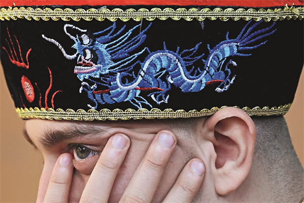 1. 6 de marzo de 2024. Un estudiante iraní luce un gorro chino de estilo antiguo tejido con un patrón de dragón, durante una actividad cultural china, celebrada en la Universidad Allameh Tabataba’i.