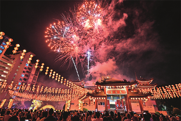 2. 24 de febrero de 2024. Fuegos artificiales durante las celebraciones de la Fiesta de los Faroles en el Templo Thean Hou en Kuala Lumpur, Malasia.