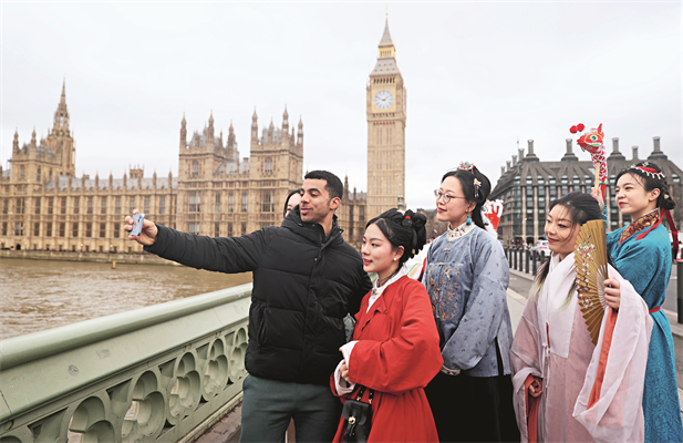4. 25 de febrero de 2024. Jóvenes chinas vestidas con atuendos del estilo tradicional hanfu difunden la cultura china en el río Támesis, en Londres.