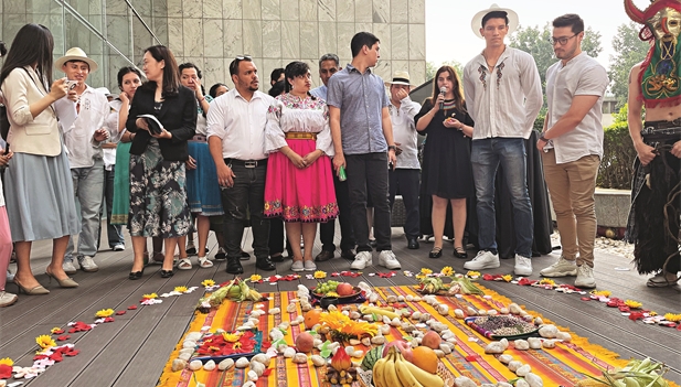 Ofrenda de comida a la Pachamama. Magdalena Rojas CON motivo del Inti Raymi, o Fiesta del Sol, la Embajada de Ecuador en Beijing organizó una animada fiesta que contó con la presencia de la comunidad ecuatoriana, además de algunos representantes de medios de prensa locales. La festividad, en que se da gracias a la Pachamama o Madre Tierra, se celebra tradicionalmente el 21 de junio de cada año. Es una festividad en que se hacen diversas ofrendas de bebidas y comestibles a la Pachamama, y que a su vez, marca el inicio de un nuevo ciclo agrícola. Una festividad conjunta La celebración no solo se festeja en Ecuador, sino en muchas comunidades andinas de países como Bolivia, Perú, Colombia, Argentina y Chile. María Soledad Córdoba, embajadora de Ecuador en China, destacó la importancia de esta festividad y de compartir parte de este legado cultural e histórico con el público chino. “Deseamos difundir nuestra cultura y nuestras tradiciones. El Inti Raymi efectivamente se celebra en muchos países, pero más en nuestros países andinos”, señaló la embajadora. “Yo creo que se puede hacer un símil con el cambio climático ahora y con la necesidad de proteger lo que tenemos y de agradecer, porque cada cosa que tenemos viene de la Tierra. Es una manara de reconocer lo que tenemos, agradecer y promover estas tradiciones”. En esa línea, Córdoba también destacó los esfuerzos del Gobierno chino en pos de un desarrollo sustentable. “Creo que todos los países del mundo agradecemos estos esfuerzos, [ya que] el tema del cambio climático nos compete a todos. No hay un país que pueda decir que está fuera de esto o que está libre de los riesgos que esto significa”, declaró. La celebración también contó con comida tradicional de Ecuador, como empanadas y chicha, además de un baile titulado Juyayay, representado por el grupo Danza Ecuador. Efraín Raza, estudiante ecuatoriano quien está cursando sus estudios de pregrado en la Universidad de Deportes de Beijing, fue parte del elenco. “Siempre me ha gustado compartir y representar a mi país a través de la danza, y esta es una forma de conectarme a Ecuador estando aquí en Beijing”, dijo. La agrupación, compuesta por otros estudiantes ecuatorianos que viven en Beijing, ha participado en diferentes festivales culturales y en diversas universidades. A futuro, la Embajada de Ecuador planea organizar otras actividades culturales tales como ciclos de películas, festivales gastronómicos y actuaciones musicales, con el fin de seguir promoviendo más sus tradiciones.  |