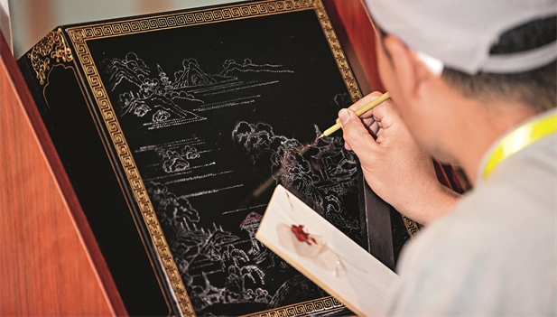 28 de mayo de 2023. Un artesano demuestra sus habilidades en la laca pulida a mano de Pingyao, en Beijing. Cnsphoto